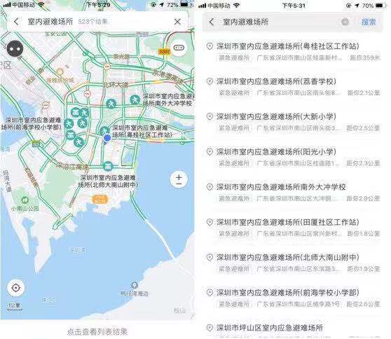 目前,深圳市已建成的592處室內(nèi)應(yīng)急避難場所位置信息已經(jīng)標(biāo)注在騰訊地圖上。深圳市民可在騰訊地圖APP端,或在“騰訊地圖+”微信小程序中,搜索“室內(nèi)應(yīng)急避難場所”,獲取附近所有室內(nèi)應(yīng)急避難場所的地理位置、名稱、地址、緊急聯(lián)系電話等信息,同時可一鍵導(dǎo)航,盡快抵達(dá)。