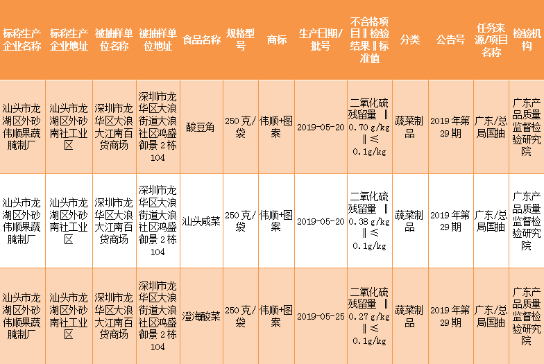 龍華大浪大江南百貨商場(chǎng)賣的酸豆角、汕頭咸菜和澄海酸菜因二氧化硫殘留量超標(biāo)上黑榜了