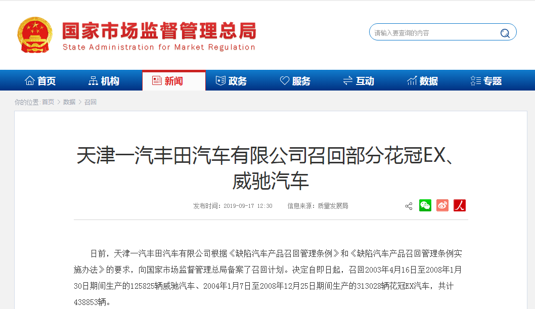 日前,天津一汽豐田汽車有限公司根據(jù)《缺陷汽車產(chǎn)品召回管理?xiàng)l例》和《缺陷汽車產(chǎn)品召回管理?xiàng)l例實(shí)施辦法》的要求,向國家市場監(jiān)督管理總局備案了召回計(jì)劃。決定自即日起,召回2003年4月16日至2008年1月30日期間生產(chǎn)的125825輛威馳汽車、2004年1月7日至2008年12月25日期間生產(chǎn)的313028輛花冠EX汽車,共計(jì)438853輛。
