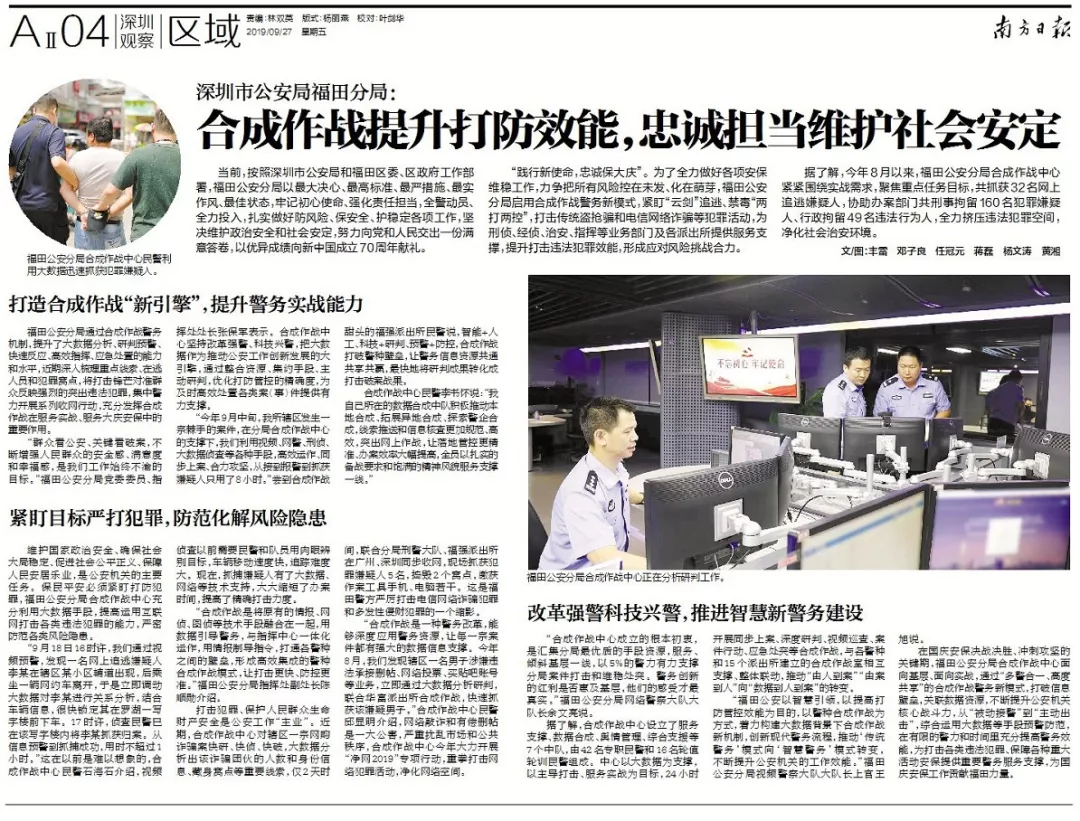 在大慶安保決戰(zhàn)決勝、沖刺攻堅的關鍵期,福田公安分局合成作戰(zhàn)中心面向基層、面向實戰(zhàn),通過“多警合一、高度共享”的合成作戰(zhàn)警務新模式,打破信息壁壘,關聯數據資源,不斷提升公安機關核心戰(zhàn)斗力,從“被動接警”到“主動出擊”,綜合運用大數據等手段預警防范,為在有限的警力和時間里充分提高警務效能,為打擊各類違法犯罪、保障各種重大活動安保提供重要警務服務支撐,為大慶安保工作貢獻福田力量。