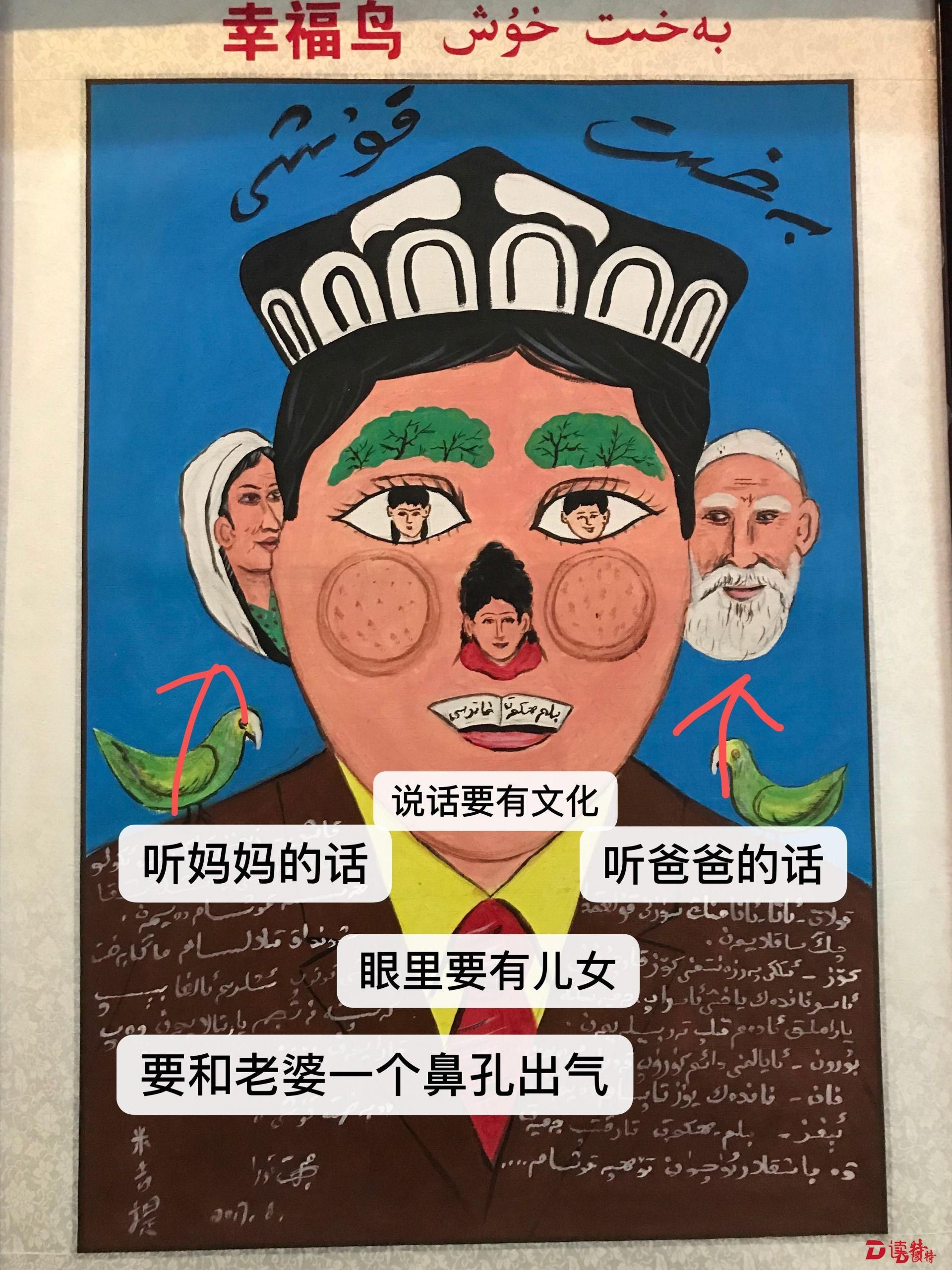牧民的帳篷、肥壯的牛羊、路旁的榆錢樹……在刀郎農(nóng)名畫展廳里記者看到,平日生活中隨處可見的事物一一被刀郎人在勞動和生活中用敏銳的目光捕捉,并將其躍然紙上,幽默中透視矛盾,夸張中充滿情緒宣泄,一幅幅作品活靈活現(xiàn)、色彩斑斕,讓人眼花繚亂,構(gòu)成了“刀郎農(nóng)民畫”畫家在處理反映現(xiàn)實主義和浪漫主義別具一格的藝術(shù)特色。