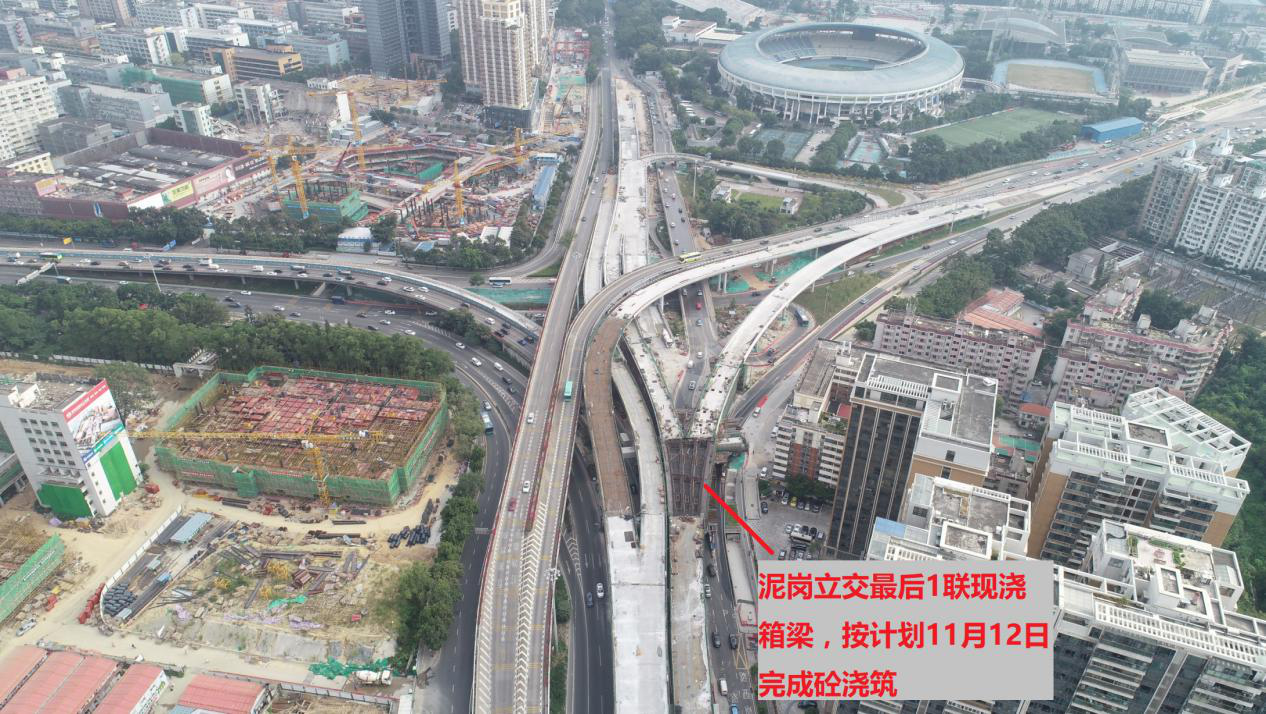 深圳特區(qū)報(bào)2019年11月9日訊 坂銀通道工程北環(huán)立交、泥崗立交橋梁主體工程將于11月12日完成最后1聯(lián)砼箱梁澆筑,迎來(lái)全線貫通。泥崗立交J1(北環(huán)大道轉(zhuǎn)泥崗東路東行)、D(北環(huán)大道轉(zhuǎn)上步北路南行)、S1(上步北路南行轉(zhuǎn)泥崗西路)匝道橋預(yù)計(jì)12月初開(kāi)放通車。