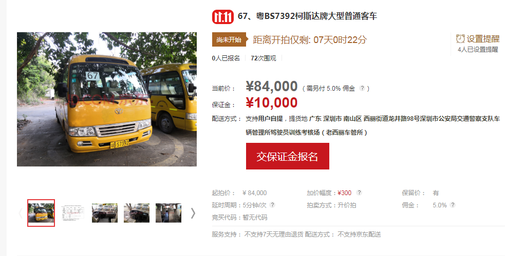 競買人應于拍賣會前在京東拍賣平臺進行實名登記注冊,注冊成功后請按京東拍賣平臺的提示進行操作;競買人在對拍賣標的物首次確認出價競拍前,按系統(tǒng)提示報名繳納10000元/輛的保證金;在競價過程中,請競買人按規(guī)定的加價幅度300元出價,若自行出價,請仔細核對好出價金額,若出現(xiàn)出價金額錯誤的情況,由買受人自行承擔后果;拍賣成交后,買受人請于拍賣成交之時起72小時內全額支付拍賣成交價款、拍賣傭金、增值稅及附加、機動車轉移登記車牌費,并到廣東華士德(深圳)拍賣行有限公司所在地(深圳市羅湖區(qū)中興路219號華興酒店4樓)簽署《拍賣成交確認書》及辦理相關手續(xù)。