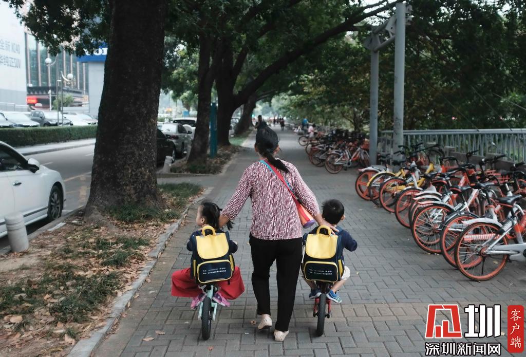2019年10月28日,福田區(qū),放學(xué)路上,一位家長帶著兩位小朋友。