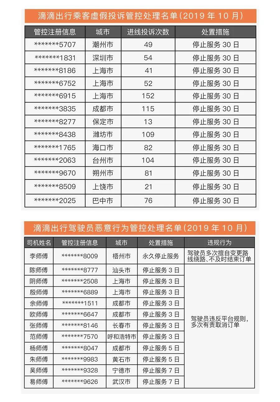 晶報(bào)2019年11月20日訊 11月20日,滴滴出行通過(guò)官方微信公眾號(hào)對(duì)10月違規(guī)司、乘“黑名單”進(jìn)行了公示。乘客黑名單中,惡意投訴次數(shù)最多的高達(dá)152次;司機(jī)黑名單中一位梧州市的李師傅因多次擅自變更路線繞路、不及時(shí)結(jié)束訂單等違規(guī)行為被永久停止服務(wù)。