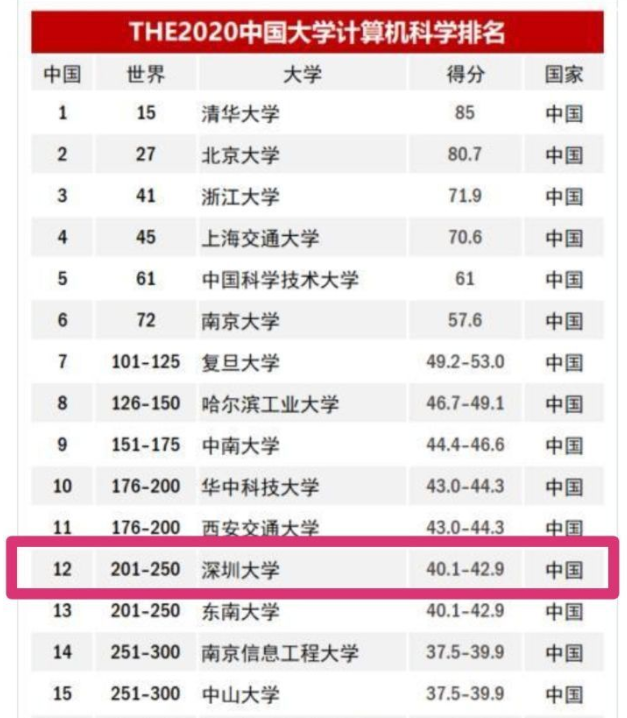 9月份,泰晤士高等教育公布了2020世界大學(xué)排名,近日又對(duì)計(jì)算機(jī)科學(xué)專業(yè)等數(shù)個(gè)熱門學(xué)科進(jìn)行排名更新。今年參與泰晤士計(jì)算機(jī)科學(xué)排名的大學(xué)從去年的684所擴(kuò)大到749所,最新排名顯示,中國內(nèi)地有6所大學(xué)的計(jì)算機(jī)科學(xué)專業(yè)進(jìn)入世界百強(qiáng)。深圳大學(xué)在中國內(nèi)地大學(xué)計(jì)算機(jī)科學(xué)專業(yè)中位列第12,較上一年度提升了1位,去年世界排名位于301-400之間,今年進(jìn)階至201-250位之間。