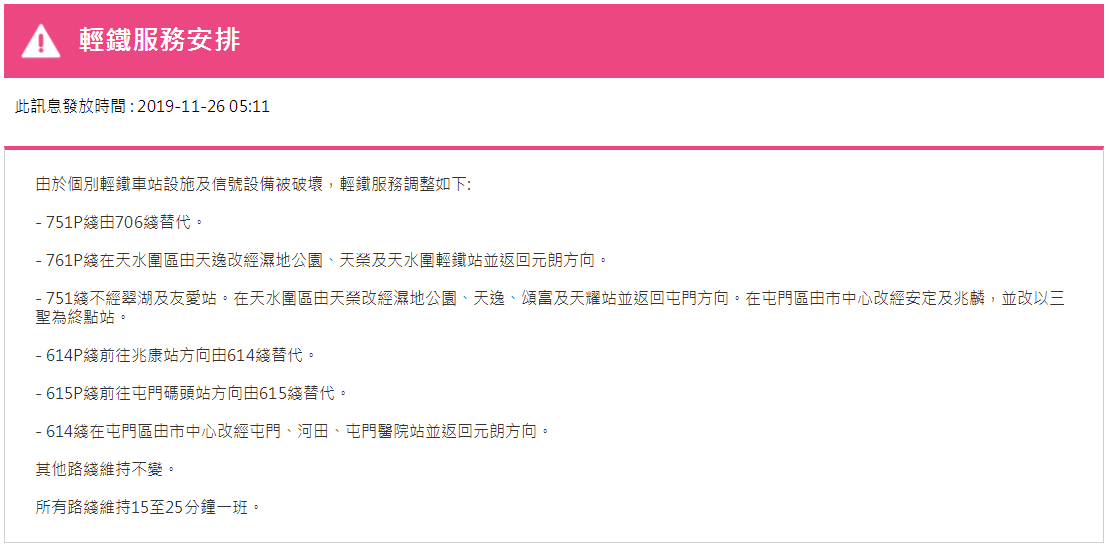 據(jù)港鐵消息,11月26日,香港地鐵各線(機(jī)場(chǎng)快線除外)、輕鐵及港鐵巴士的服務(wù)將于晚上11:30時(shí)結(jié)束。大學(xué)站繼續(xù)關(guān)閉,列車不停大學(xué)站。個(gè)別車站出入口也會(huì)暫時(shí)關(guān)閉。