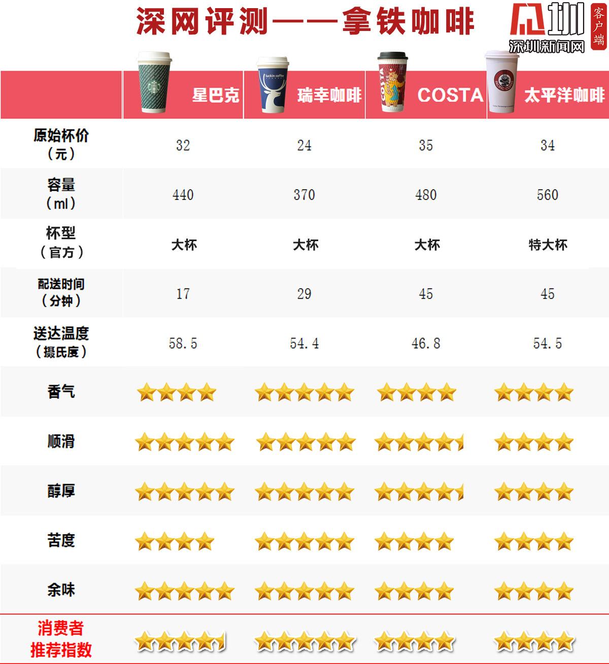 綜合“拿鐵咖啡(熱)”主觀評測的5個維度(香氣、順滑、醇厚、苦度、余味),最終瑞幸在消費者推薦指數(shù)評分中脫穎而出收獲5星好評,星巴克收獲4星半好評位居第二,Costa4、太平洋僅獲得4星評價。