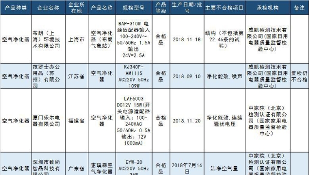 其中,深圳市艾吉森環(huán)保科技有限公司生產(chǎn)的空氣凈化器復檢仍不合格。