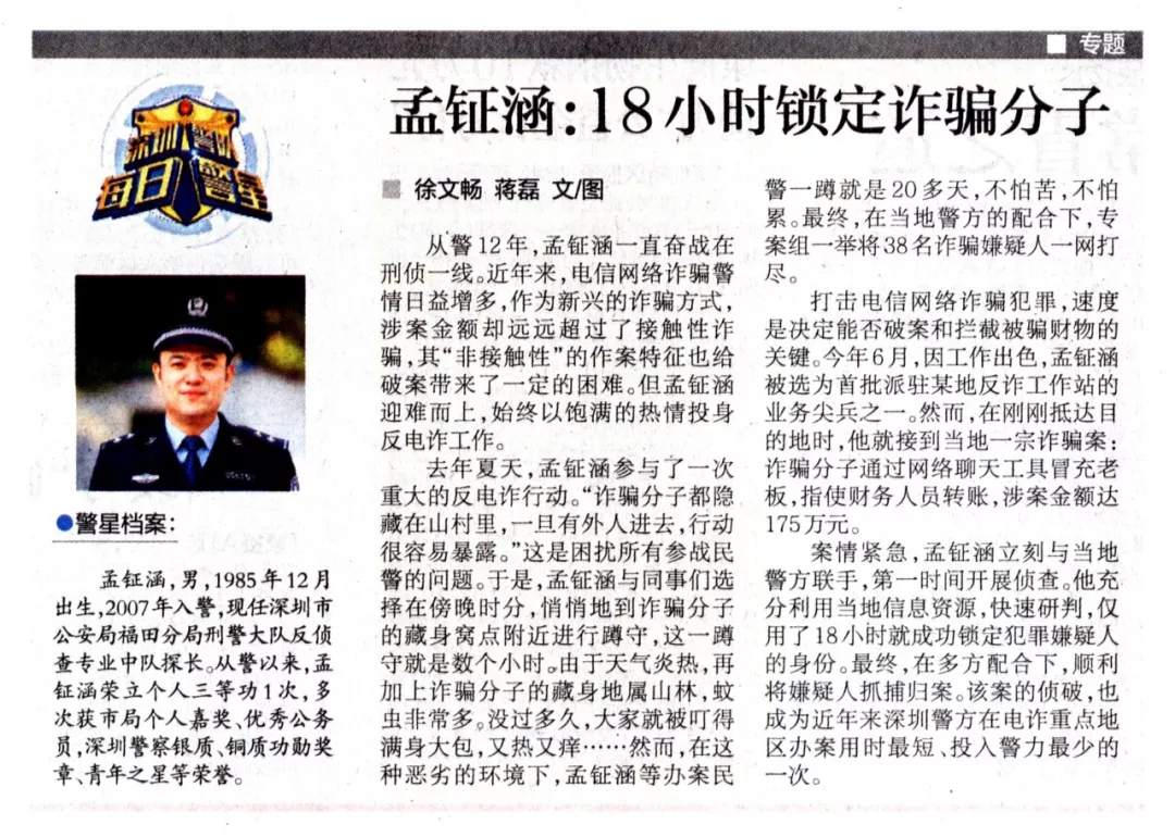 孟鉦涵,男,1985年12月出生,2007年入警,現(xiàn)任深圳市公安局福田分局刑警大隊(duì)反偵查專業(yè)中隊(duì)探長。從警以來,孟鉦涵榮立個(gè)人三等功1次,多次獲市局個(gè)人嘉獎(jiǎng)、優(yōu)秀公務(wù)員,深圳警察銀質(zhì)、銅質(zhì)功勛獎(jiǎng)?wù)?、青年之星等榮譽(yù)。