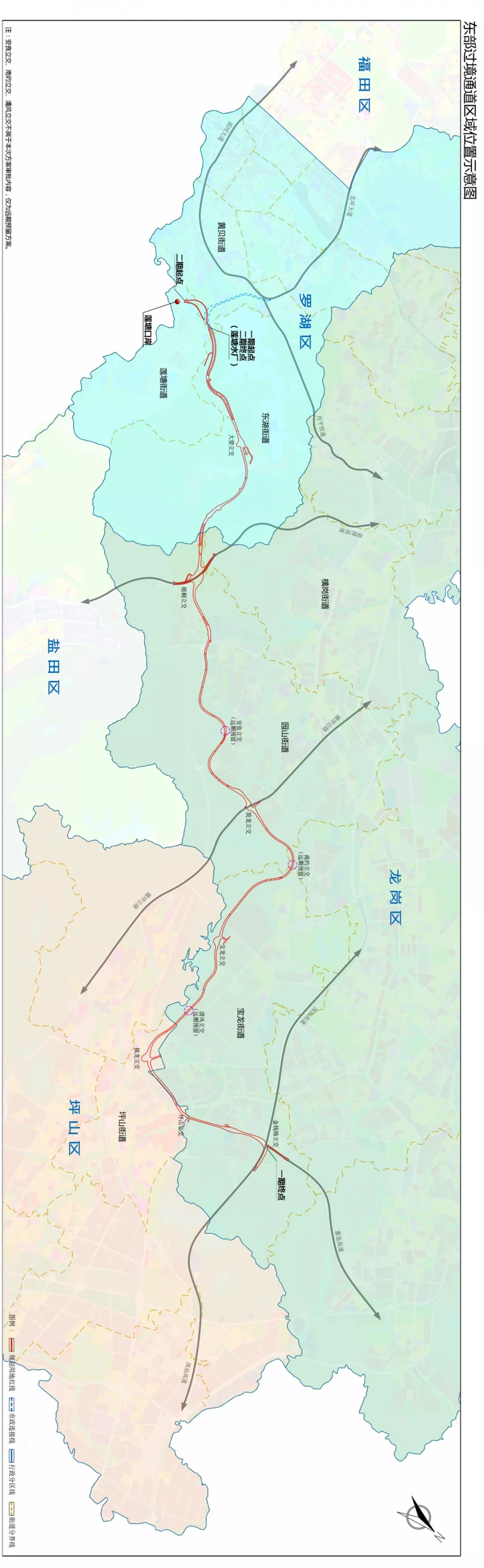 深圳市東部過境通道擬選址于羅湖區(qū)蓮塘街道、黃貝街道和東湖街道,龍崗區(qū)橫崗街道、園山街道和寶龍街道,坪山區(qū)坪山街道區(qū)域內。