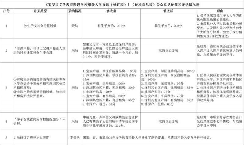 在此次公布的新修訂稿中,對去年12月公布的部分積分計(jì)算方式和加分情況進(jìn)行了重新修訂。主要表現(xiàn)在以下幾個(gè)方面:獨(dú)生子女加分由1分調(diào)整至2分;取消"非深戶籍可以以父母戶籍遷入深圳的時(shí)間計(jì)算積分"和"多子女就讀同所學(xué)校情況加分"兩項(xiàng)加分項(xiàng);此外,"寶安戶籍,學(xué)區(qū)自購商品房""深圳其他區(qū)戶籍,學(xué)區(qū)自購商品房""寶安戶籍,無房租房""深圳其他區(qū)戶籍,無房租房""非深戶購房"和"寶安戶籍,有房租房"等情況,分別在原有基礎(chǔ)分上另加5分,"深圳其他區(qū)戶籍,有房租房"和"非深戶租房"分值則保持不變,以體現(xiàn)寶安本區(qū)戶籍與其他區(qū)戶籍、非深戶購房與非深戶租房的積分梯度。