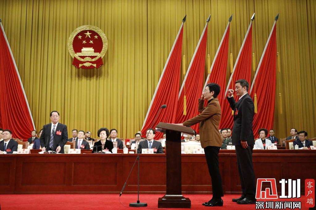 深圳市人大常委會主任駱文智(左)為新當(dāng)選的市人大常委會副主任裴蕾(右)頒發(fā)當(dāng)選證書。