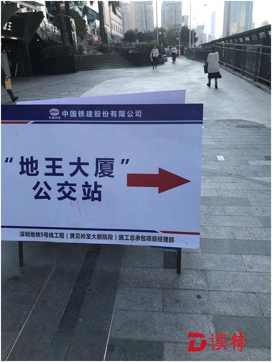 而另一處地點(diǎn),從大劇院地鐵站 F出口處往羅湖書城方向,行人須繞行街邊花園步道和街邊商家通道,對(duì)于騎自行車和電動(dòng)車的人尤其不便。而地王大廈公交站臺(tái)跟崗廈北地鐵站②公交站臺(tái)一樣非常狹窄,站臺(tái)左右兩邊的人行道狹窄處僅約兩米寬。在該處站臺(tái)背后,中國(guó)鐵建股份有限公司設(shè)置了一塊站名指示牌,署名單位為地鐵5號(hào)線施工總承包項(xiàng)目經(jīng)理部。記者詢問了一位路過的市民,市民說經(jīng)常路過此地,應(yīng)該是地鐵施工所以就占用了之前的人行道,"這里走路還好,騎車就不方便了,因?yàn)橛信_(tái)階"。