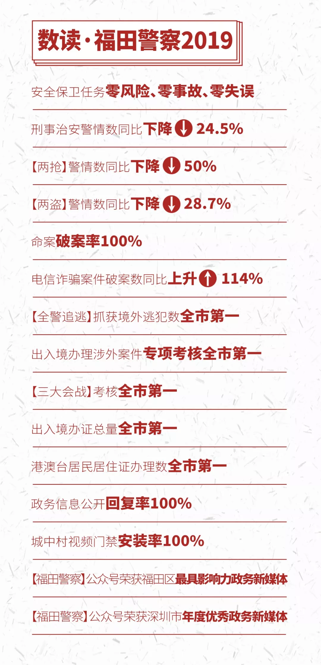 剛剛過去的2019年,是福田公安勇?lián)姑?,砥礪奮進的一年,在市局黨委和區(qū)委區(qū)政府的堅強領(lǐng)導下,福田公安穩(wěn)中求進、攻堅克難,穩(wěn)妥應對化解系列重大風險,有效護航中心城區(qū)社會政治穩(wěn)定,打贏新中國成立70周年大慶安保和澳門回歸20周年慶典安保攻堅戰(zhàn),各項重大安保活動“零風險、零事故、零失誤”;強力推進掃黑除惡、“颶風2019”等一系列專項行動,合成打擊效能突顯;持續(xù)推動現(xiàn)代化警務機制變革,改革攻堅蹄疾步穩(wěn);提升社會治安基礎治理工作,治安面貌持續(xù)向好;隊伍建設舉措剛?cè)嵯酀?,錘煉“四個鐵一般”的過硬警隊。