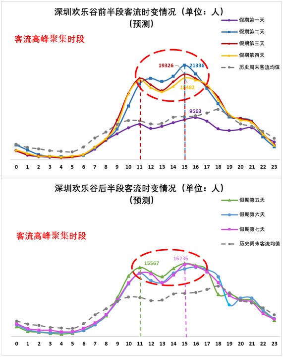 2、市內(nèi)熱門景區(qū)方面:預(yù)計1月25日至1月30日(正月初一至正月初六)深圳歡樂谷在11:00-12:00和15:00-16:00出現(xiàn)客流高峰、東部華僑城在10:00-11:00出現(xiàn)客流高峰;預(yù)計1月25日至1月27日(正月初一至正月初三),歡樂海岸在15:00前后出現(xiàn)客流高峰。