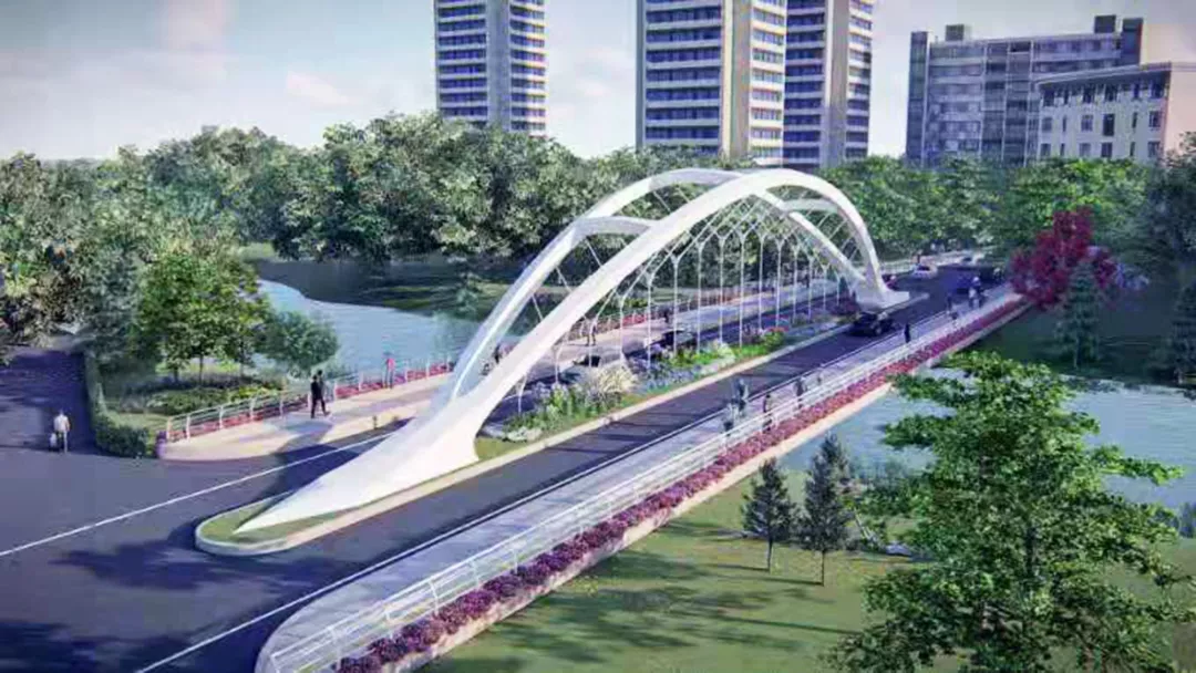 據(jù)介紹,凌菊路跨大沙河橋主體結(jié)構(gòu)需與大沙河生態(tài)長廊同步建設(shè),項目工期緊、任務(wù)重。根據(jù)相關(guān)規(guī)定,橋梁在河中不能設(shè)支墩,與大沙河河道需滿足2.5m的凈高要求,橋梁跨度大。最終,該項目采用下承式拱結(jié)構(gòu)鋼橋,鋼結(jié)構(gòu)橋梁可在工廠提前預(yù)制,運輸至現(xiàn)場安裝,解決了技術(shù)和工期緊等難題。