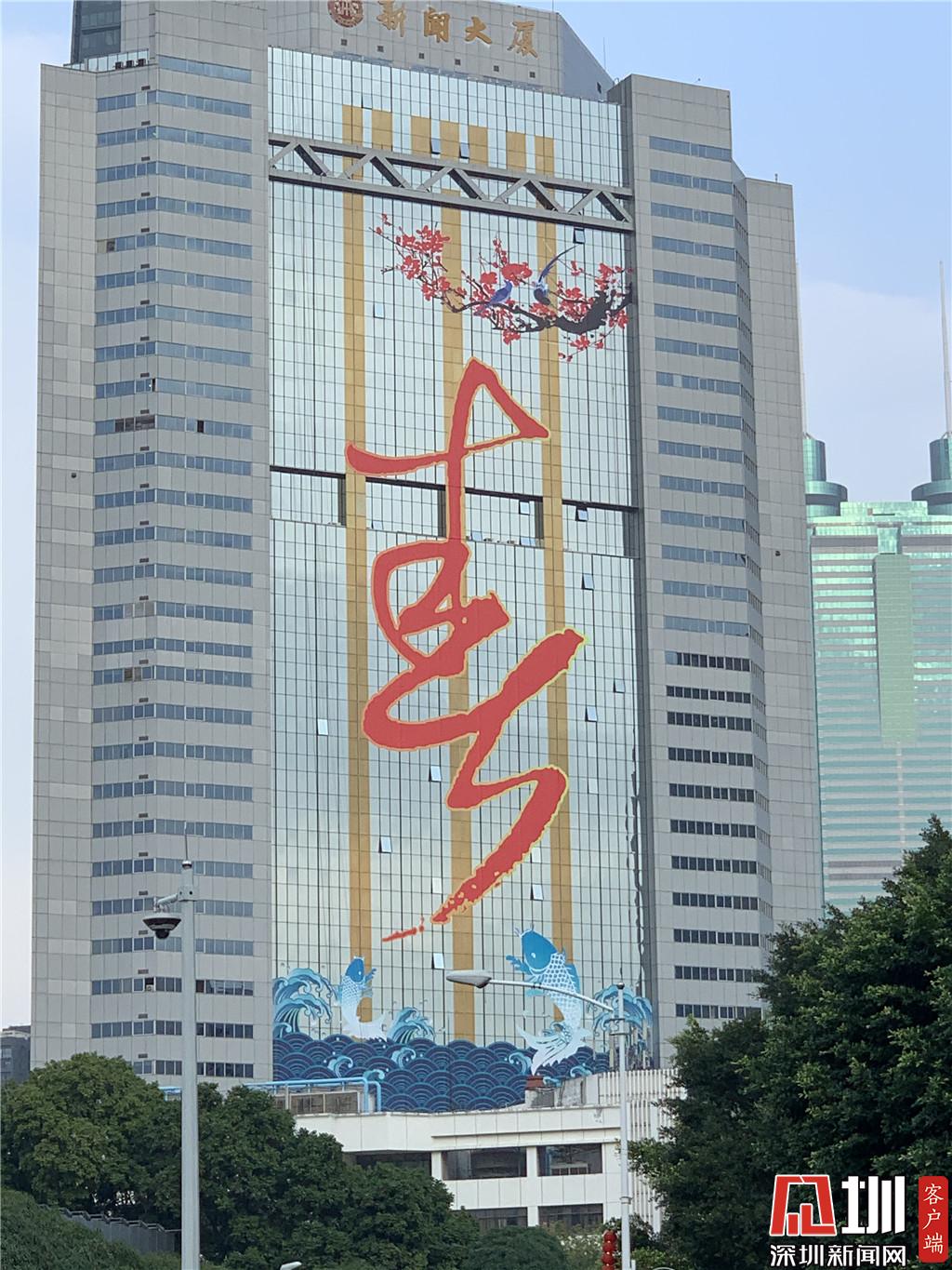 新聞大廈外立面設(shè)置巨幅迎春壁畫(huà)。