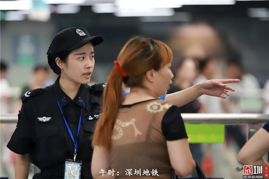 午時(shí):12點(diǎn)56分,深圳地鐵安檢人員謝幗英為乘客指路。