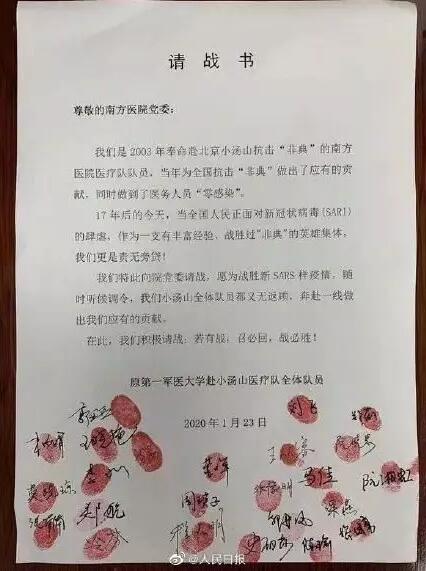 請戰(zhàn)的人員中,有十多年前曾遠赴小湯山抗擊“非典”的隊員,有其他在職的醫(yī)生和護理工作者,還有表示“若有戰(zhàn),召必回!不計報酬,無論生死”的離退休老干部群體。一封寫滿簽名并按滿紅手印的“請戰(zhàn)書”,就像跳動著一顆顆紅心的畫卷,引發(fā)網(wǎng)友紛紛感動留言。