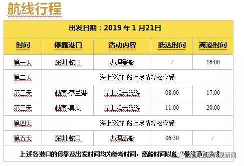 據(jù)悉,歌詩達威尼斯號郵輪1月21日16時從蛇口郵輪母港出發(fā),為6天5晚的航程,航行路線為:深圳-下龍灣(蔡蘭港)-峴港(真美)-深圳。