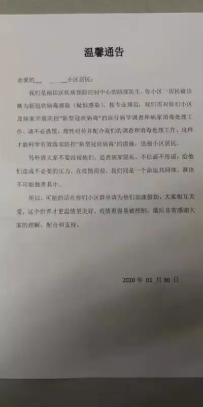 1月30日,由于深圳一小區(qū)出現(xiàn)新冠狀病毒疑似感染病例,福田區(qū)疾病預(yù)防控制中心的防疫醫(yī)生發(fā)布了這則通告。通告除了呼吁小區(qū)居民配合調(diào)查及消毒處理工作外,還特地懇請大家“不要歧視,在疫情面前,我們是同一個命運共同體,誰也不可能獨善其身?!辈恢獮楹?,雖不是湖北人也未曾受過歧視,但還是被這寥寥數(shù)字的“請求”溫暖了。