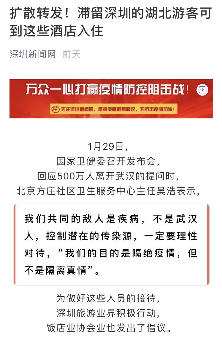 日前深圳就公布了一批指定接待湖北游客的酒店信息,深圳旅游業(yè)界積極行動,飯店協(xié)會業(yè)也發(fā)出倡議:疫區(qū)游客是我們的同胞,不僅不能歧視,要伸出援手幫助他們!