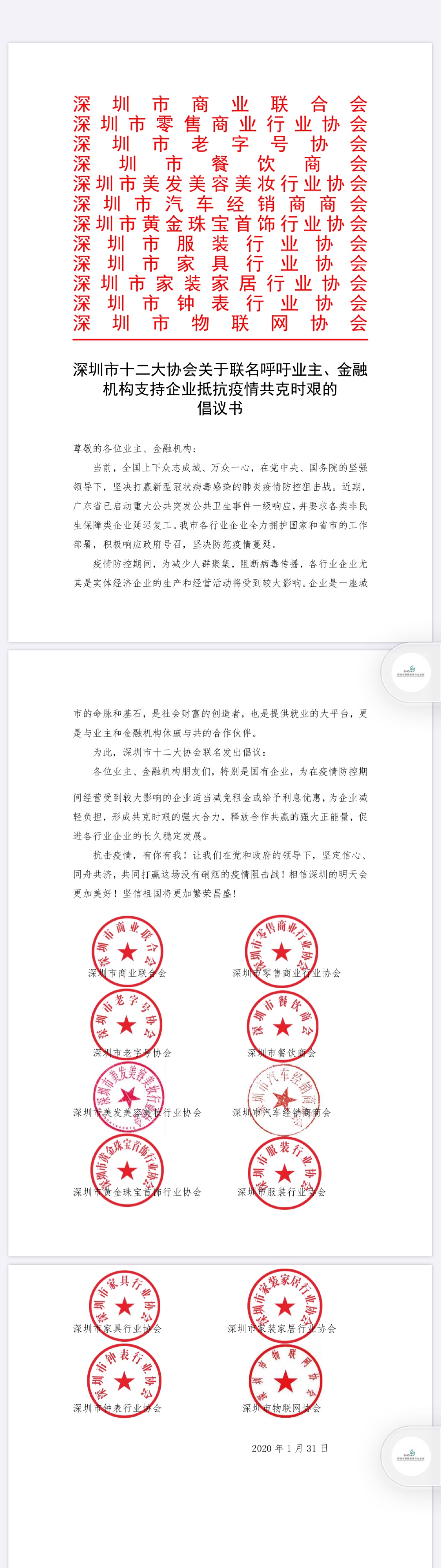 見(jiàn)圳客戶端·深圳新聞網(wǎng)2020年2月1日訊(見(jiàn)圳客戶端、深圳新聞網(wǎng)記者 金洪竹)1月31日深夜,一份特別的倡議書(shū)在網(wǎng)絡(luò)熱傳。深圳市商業(yè)聯(lián)合會(huì)、深圳市零售商業(yè)行業(yè)協(xié)會(huì)、深圳老字號(hào)協(xié)會(huì)、深圳市餐飲商會(huì)、深圳市美發(fā)美容美妝行業(yè)協(xié)會(huì)、深圳市汽車(chē)經(jīng)銷(xiāo)商協(xié)會(huì)、深圳市黃金珠寶首飾行業(yè)協(xié)會(huì)、深圳市服裝行業(yè)協(xié)會(huì)、深圳市家具行業(yè)協(xié)會(huì)、深圳市家裝家居行業(yè)協(xié)會(huì)、深圳市鐘表行業(yè)協(xié)會(huì)和深圳市物聯(lián)網(wǎng)協(xié)會(huì)等12家商協(xié)會(huì)發(fā)出聯(lián)名倡議,呼吁業(yè)主、金融機(jī)構(gòu)支持企業(yè)抵抗疫情、共克時(shí)艱。