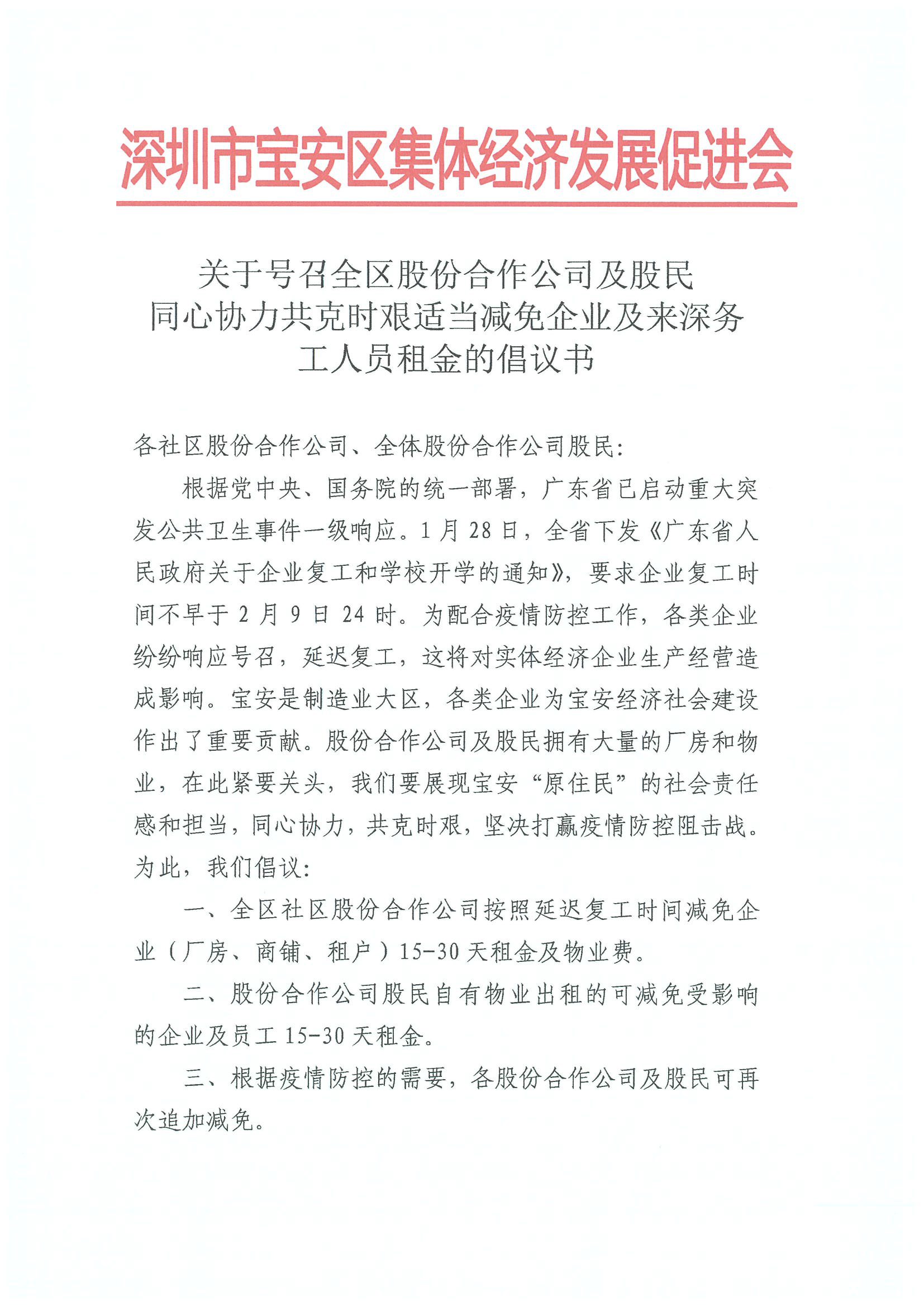 深圳新聞網(wǎng)寶安訊 “疫情防控,人人有責(zé),萬(wàn)眾一心,眾志成城,每人貢獻(xiàn)一份力量,將匯聚成打贏(yíng)疫情防控阻擊戰(zhàn)的磅礴力量?!?月1日晚,寶安區(qū)集體資產(chǎn)管理局指導(dǎo)寶安區(qū)集體經(jīng)濟(jì)發(fā)展促進(jìn)會(huì)向?qū)毎矃^(qū)各社區(qū)股份合作公司、全體股份合作公司股民發(fā)出《同心協(xié)力共克時(shí)艱適當(dāng)減免企業(yè)及來(lái)深務(wù)工人員租金的倡議書(shū)》,號(hào)召全區(qū)股份合作公司及股民適當(dāng)減免企業(yè)及來(lái)深務(wù)工人員15-30天租金及物業(yè)費(fèi),并根據(jù)疫情防控的需要可再次追加減免。