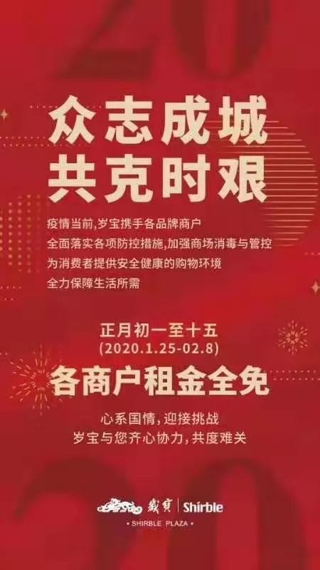 華潤(rùn)置地宣布免收1月25日—2月9日全國(guó)所有商業(yè)項(xiàng)目的租金,與商戶攜手共進(jìn)。