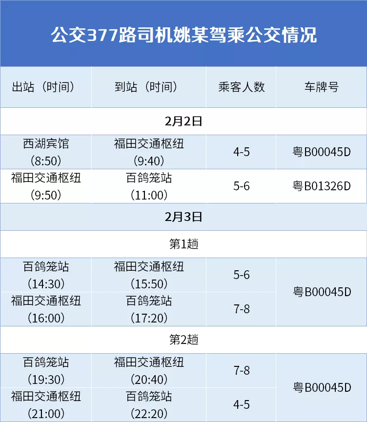 2月2日上午,姚某到車隊(duì)報(bào)到,按照公司疫情防控工作規(guī)定,經(jīng)體溫檢測(cè)正常后,車隊(duì)安排姚某隨377路跟班一趟(先后搭乘2臺(tái)車,分別是粵B00045D、8時(shí)50-9時(shí)40分、粵B01326D、9時(shí)50-11時(shí))共約2小時(shí),期間先后同車乘坐乘客11名。車載視頻顯示,姚某多數(shù)時(shí)間坐在公交車中后部,并佩戴口罩。