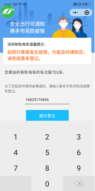 第一步:乘客使用微信掃描列車車廂內(nèi)的登記碼,登記頁面會(huì)自動(dòng)顯示上次登記的手機(jī)號(hào)或在“深圳通+”小程序中注冊(cè)的手機(jī)號(hào)碼: