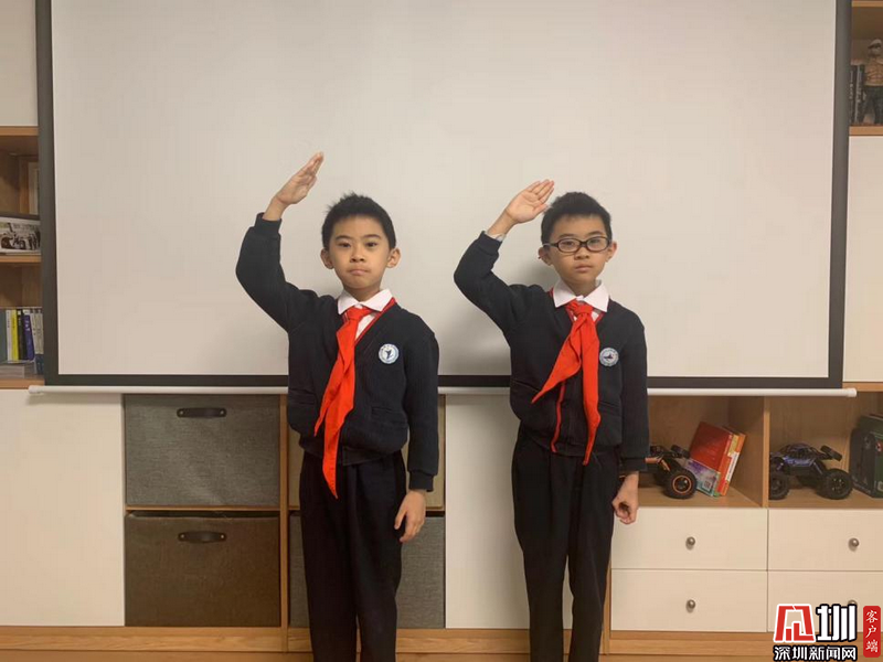 網(wǎng)上開學第一天,雙胞胎學生穿好禮服、佩戴紅領(lǐng)巾,莊嚴地敬禮。