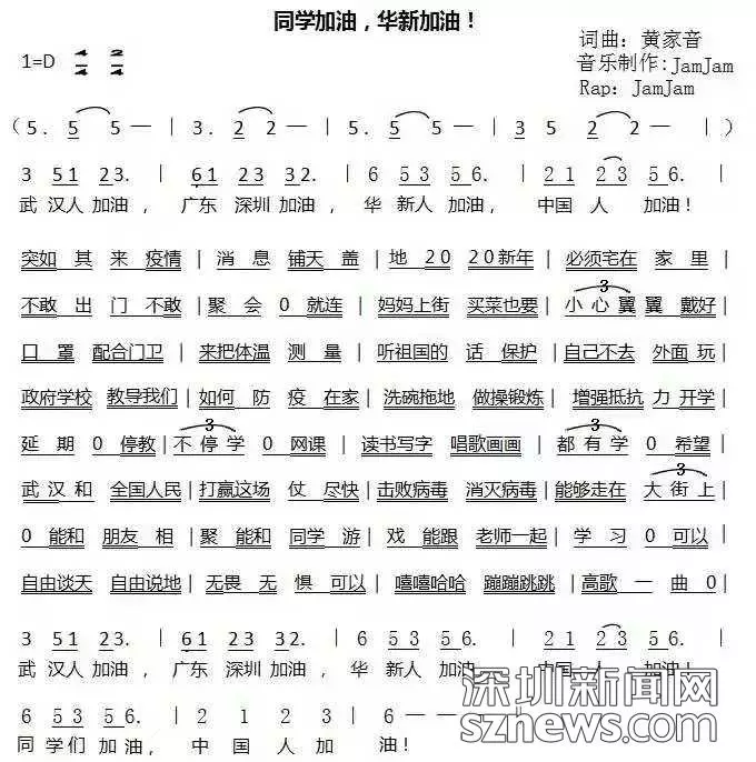 開學(xué)首日,深圳市福田區(qū)華新小學(xué)音樂教師黃家音作詞作曲《同學(xué)加油華新加油》祝福武漢,叮囑同學(xué)。