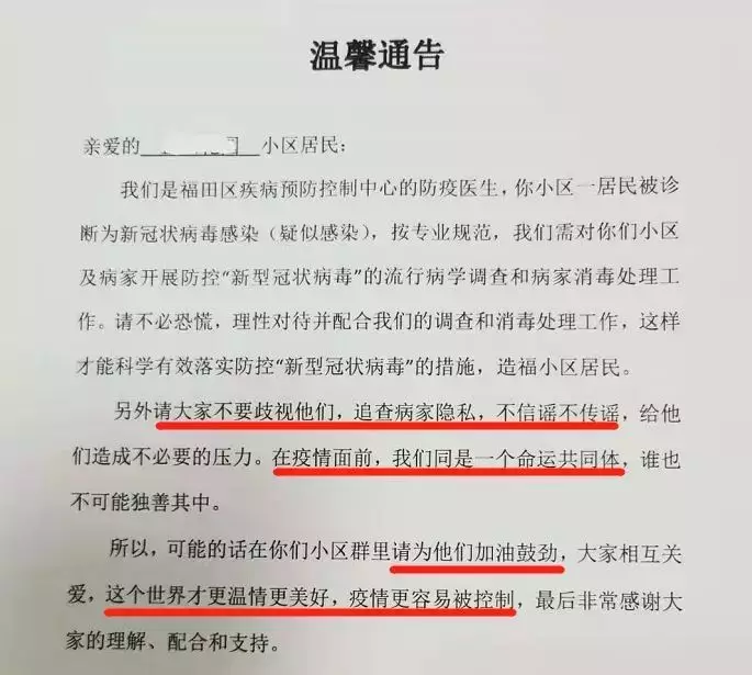 “疫情面前,我們同是一個(gè)命運(yùn)共同體”“大家相互關(guān)愛(ài),這個(gè)世界才更溫情美好,疫情更容易被控制……”1月30日,位于深圳福田區(qū)的一小區(qū)出現(xiàn)新冠肺炎疑似感染病例,福田區(qū)疾病預(yù)防控制中心的防疫醫(yī)生隨即發(fā)布了這則通告,瞬間刷屏了深圳人的朋友圈。通告除了呼吁小區(qū)居民配合調(diào)查及消毒處理工作外,還特地懇請(qǐng)大家“不要歧視,在疫情面前,我們是同一個(gè)命運(yùn)共同體,誰(shuí)也不可能獨(dú)善其身。”寥寥數(shù)字的“請(qǐng)求”,感動(dòng)無(wú)數(shù)人。
