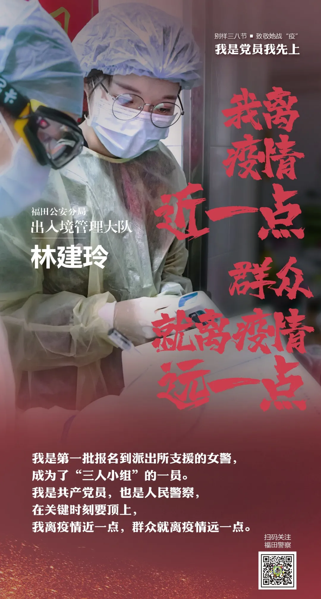 長期在窗口服務的出入境管理大隊女民警林建玲主動請戰(zhàn),成為分局黨員突擊隊首批隊員,奔赴一線,支援抗疫。