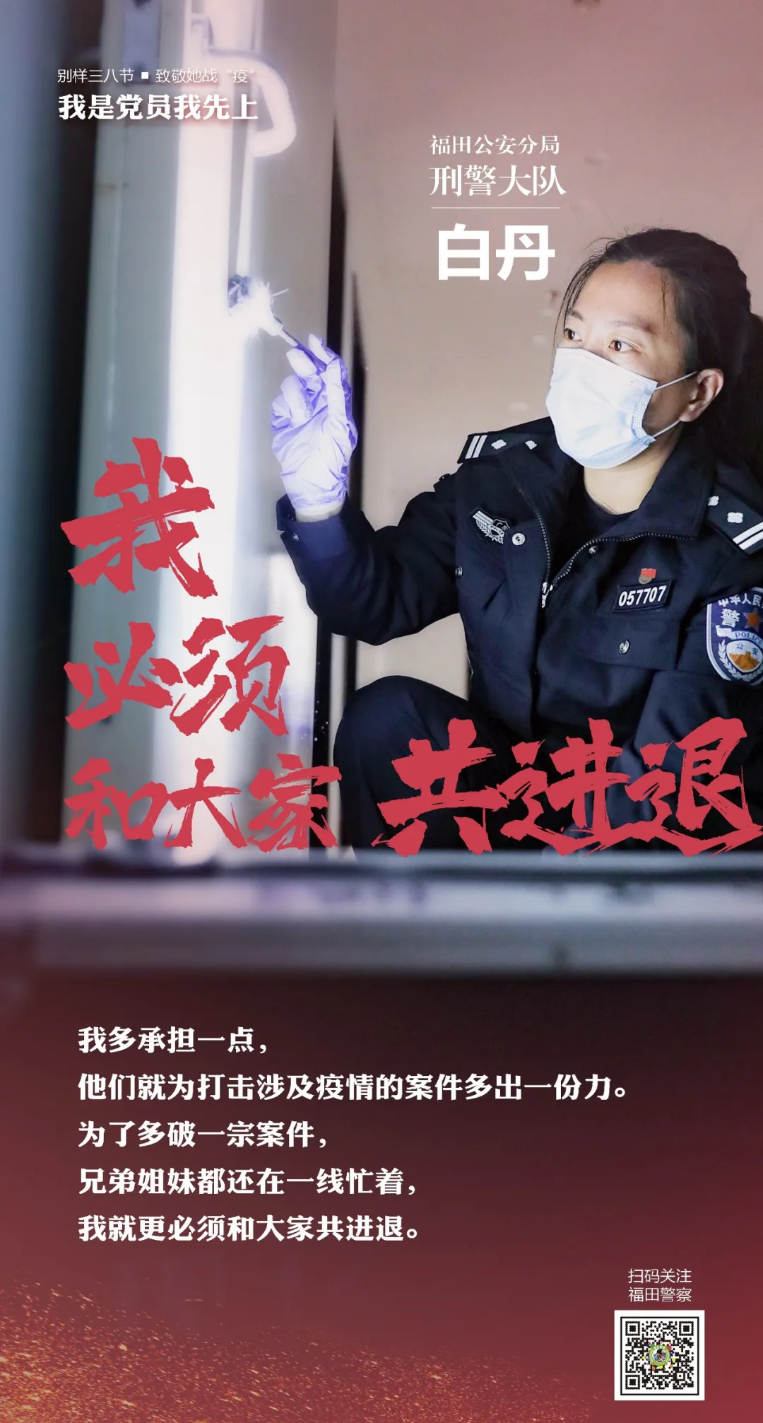 疫情來時顯本色,危難面前見擔當。福田公安分局有1966名民警,其中女警327名,占比16.6%,她們是母親、妻子、女兒,看似柔弱,實則堅毅,在與疫情的較量中,她們的身影從未缺席。摘掉口罩,臉頰勒痕清晰可見;脫掉防護服,汗水早已濕透衣背……