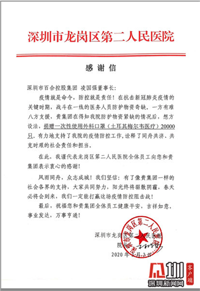 “我不認識你,但我要謝謝你!”3月2日,龍崗區(qū)第二人民醫(yī)院院長林源泉還特地向百合集團凌國強董事長寫了一封感謝信。