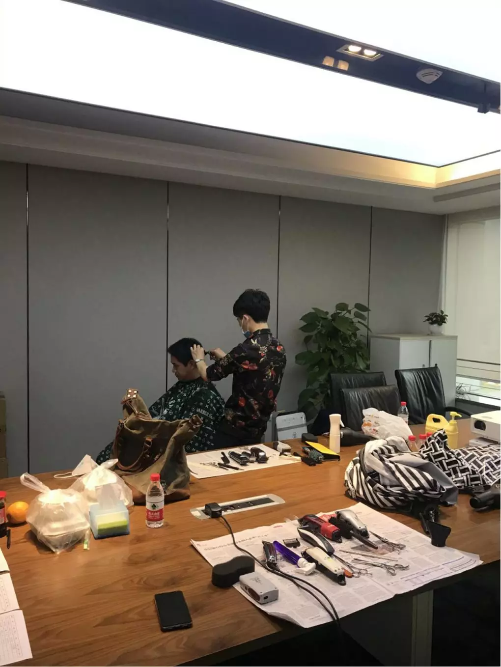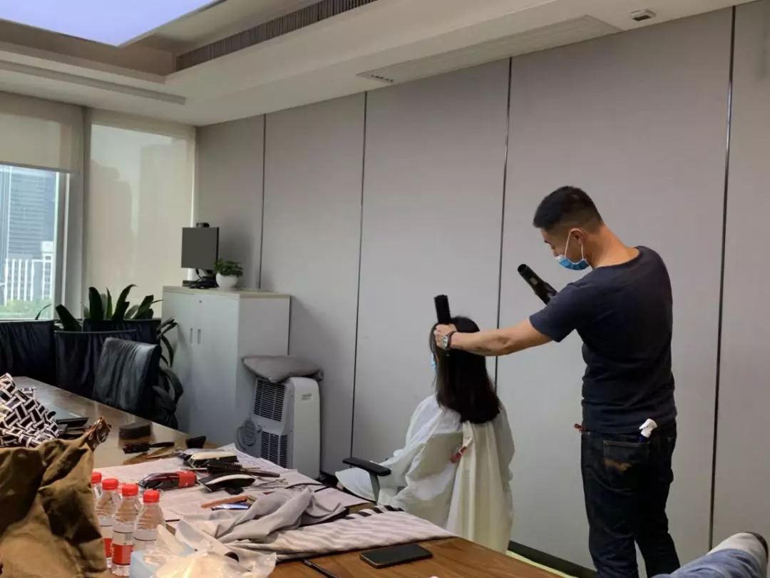 公司本部,1303會(huì)議室,臨時(shí)理發(fā)室“生意”也火爆極了。公司工會(huì)邀請(qǐng)了兩名專業(yè)的Tony老師,為近90名員工提供免費(fèi)的理發(fā)服務(wù)。為減少人員聚集,理發(fā)采取提前線上預(yù)約,分時(shí)段進(jìn)行,確保安全的同時(shí),盡可能讓有需要的同事都能理上發(fā)。鋪上一次性地毯,坐上椅子,圍上一次性“斗篷”,Tony老師一頓熟練的剪發(fā)操作后,再用吹風(fēng)機(jī)整好造型,就完成了理發(fā)的全過(guò)程。臨時(shí)理發(fā)師的搭建,有效解決了員工生活上的困難,幫助他們以良好的精神面貌投入工作來(lái)。