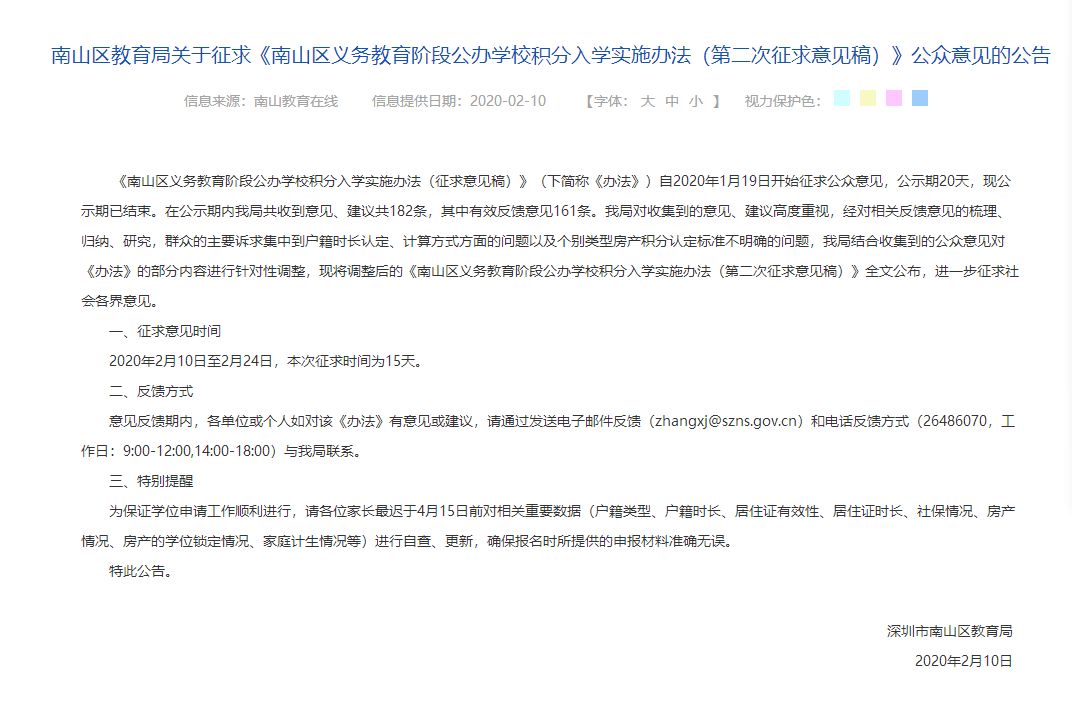1月19日,南山區(qū)教育局第一次征求意見發(fā)出后,共收集到關(guān)于積分算法調(diào)整的反饋意見182條,并于2月10日第二次發(fā)布《南山區(qū)義務(wù)教育階段公布學(xué)校積分入學(xué)實(shí)施辦法》征求意見稿(以下簡稱《意見》),根據(jù)《意見》內(nèi)容,擬調(diào)整2020年積分入學(xué)辦法。
