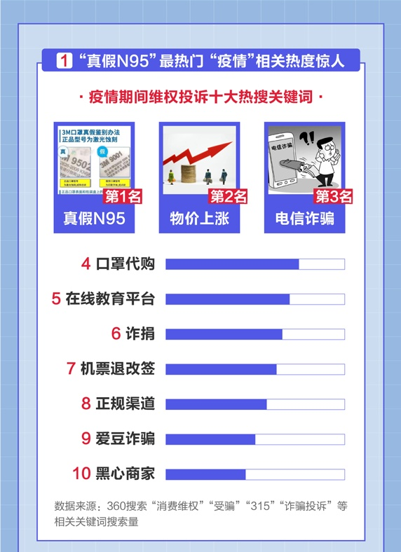 深圳商報(bào)2020年3月15日訊 360搜索、360瀏覽器今日發(fā)布《315消費(fèi)者維權(quán)數(shù)據(jù)報(bào)告》(以下簡稱《報(bào)告》)。報(bào)告顯示,“真假N95”、“口罩代購”等與口罩質(zhì)量相關(guān)的訊息成熱議話題。