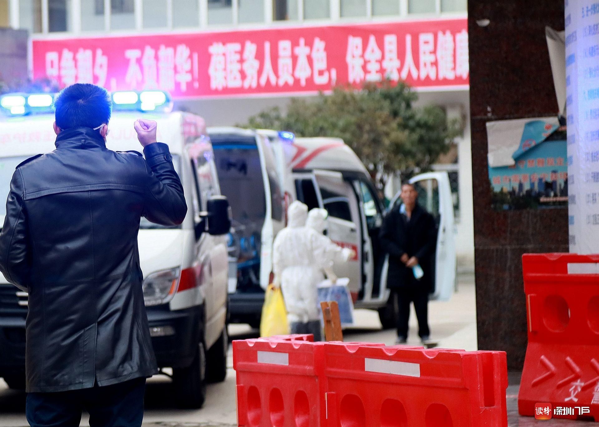 2月29日,監(jiān)利縣中醫(yī)院,一位重癥患者即將轉往荊州救治?;颊叩膬鹤勇動嵹s來,遠遠地向父親舉起拳頭,高喊“加油”。