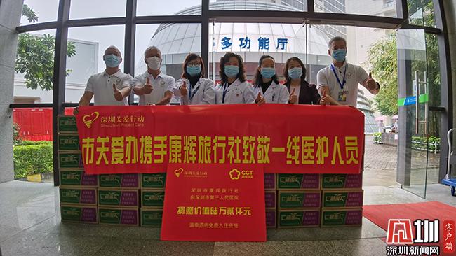 為表達(dá)對(duì)醫(yī)護(hù)人員的感謝,深圳市康輝旅行社捐贈(zèng)價(jià)值6.2萬(wàn)元的廣東省內(nèi)溫泉酒店免費(fèi)入住券40張。每張入住券可在廣東省內(nèi)指定酒店入住雙床房或大床房?!耙咔槠陂g,我們康輝人一直都在為抗擊疫情獻(xiàn)綿薄之力。”深圳市康輝旅行社有限公司董事總經(jīng)理滿炎權(quán)告訴記者,在疫情前期,全國(guó)各地醫(yī)用物資告急。各地康輝分公司迅速自我組織、自籌資金,聯(lián)系在國(guó)外的康輝旅行社的領(lǐng)隊(duì)及導(dǎo)游購(gòu)買大量醫(yī)療物資回國(guó)?!艾F(xiàn)在國(guó)內(nèi)醫(yī)療物資暫時(shí)不缺了,我們深圳康輝送給三院的醫(yī)護(hù)人員溫泉酒店入住券,希望他們?cè)谝咔榻Y(jié)束后,能好好休息。”