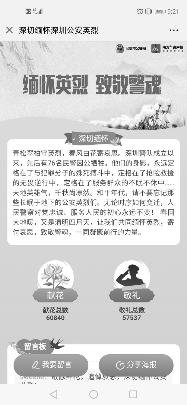 據(jù)介紹,鑒于當(dāng)前疫情防控形勢,市公安局不組織集體祭掃活動,通過公安內(nèi)網(wǎng)、互聯(lián)網(wǎng)等網(wǎng)絡(luò)開設(shè)“緬懷英烈”專欄開展“網(wǎng)上祭掃”活動,市民群眾可點擊深圳公安微信公眾號,向公安英烈獻(xiàn)花、留言,寄托哀思,致敬警魂。
