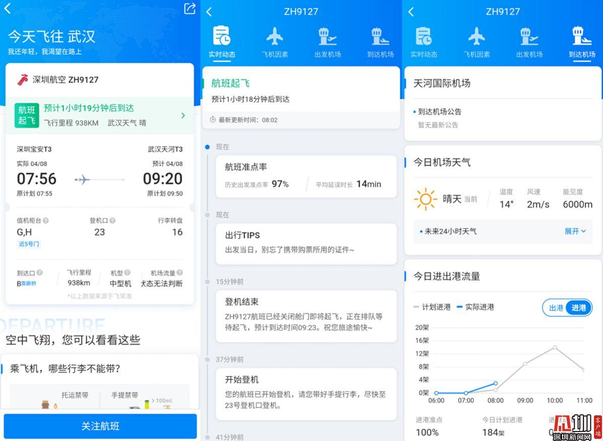 見圳客戶端·深圳新聞網(wǎng)2020年4月8日訊(見圳客戶端、深圳新聞網(wǎng)記者 張喆 陳致遠(yuǎn) 鐘鴻冰)4月8日7時(shí)55分,深圳航空Z(yǔ)H9127航班從深圳寶安國(guó)際機(jī)場(chǎng)起飛。這是自武漢市解除離漢離鄂通道管控措施后,從深圳機(jī)場(chǎng)飛往武漢的首架客運(yùn)航班。