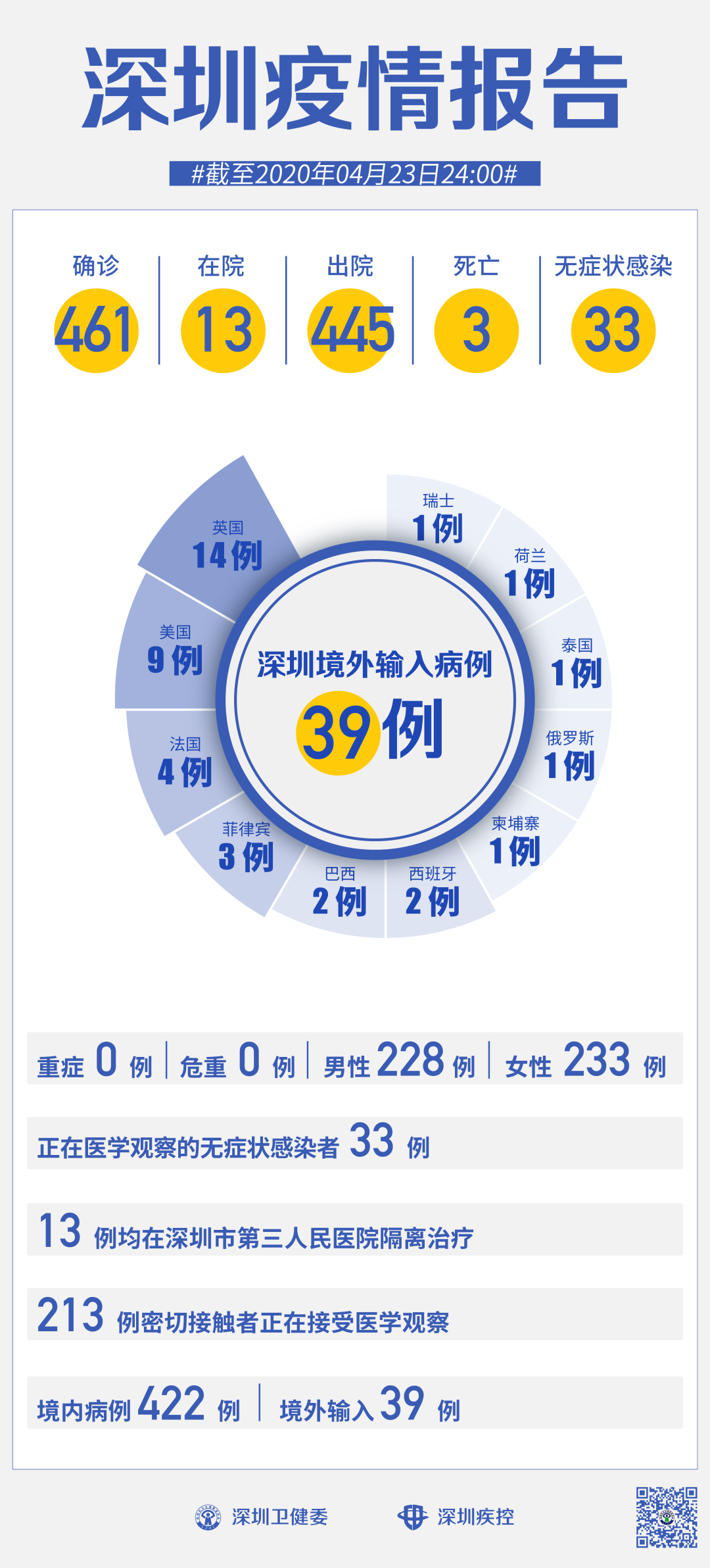 截至4月23日24時,深圳累計報告新冠肺炎病例461例。4月23日當(dāng)天新增出院5例。