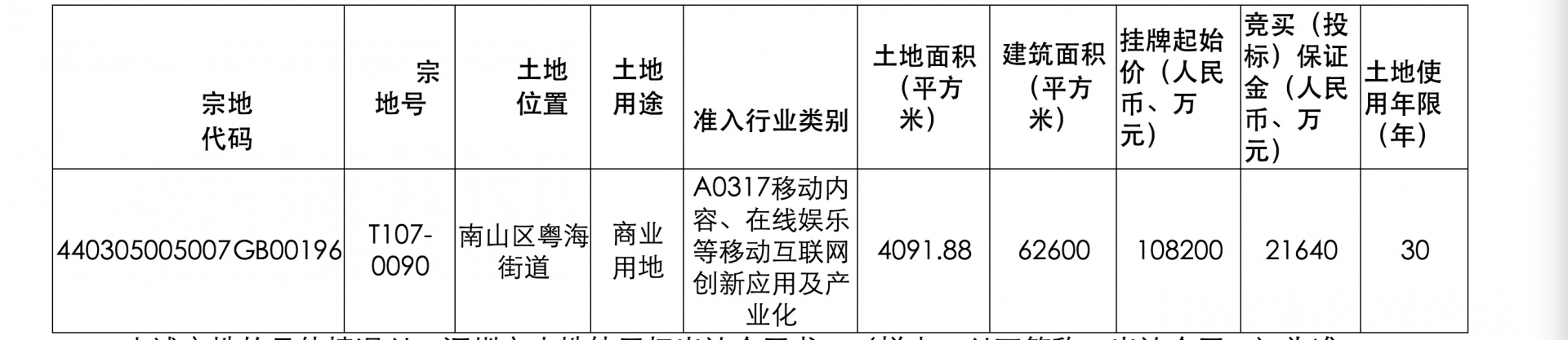 根據(jù)公告,T107-0090宗地位于南山區(qū)粵海街道創(chuàng)業(yè)路,后海河畔,土地用途為商業(yè)用地,準(zhǔn)入類別為A0317移動內(nèi)容、在線娛樂等移動互聯(lián)網(wǎng)創(chuàng)新應(yīng)用及產(chǎn)業(yè)化,土地面積4091.88平方米,建筑面積62600平方米,容積率:≤15.3,掛牌起始價108200萬元,土地使用年限30年。掛牌期自2020年6月3日起至2020年6月12日15時止。
