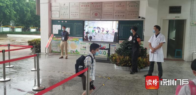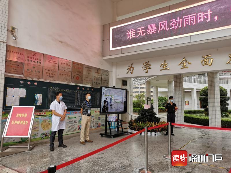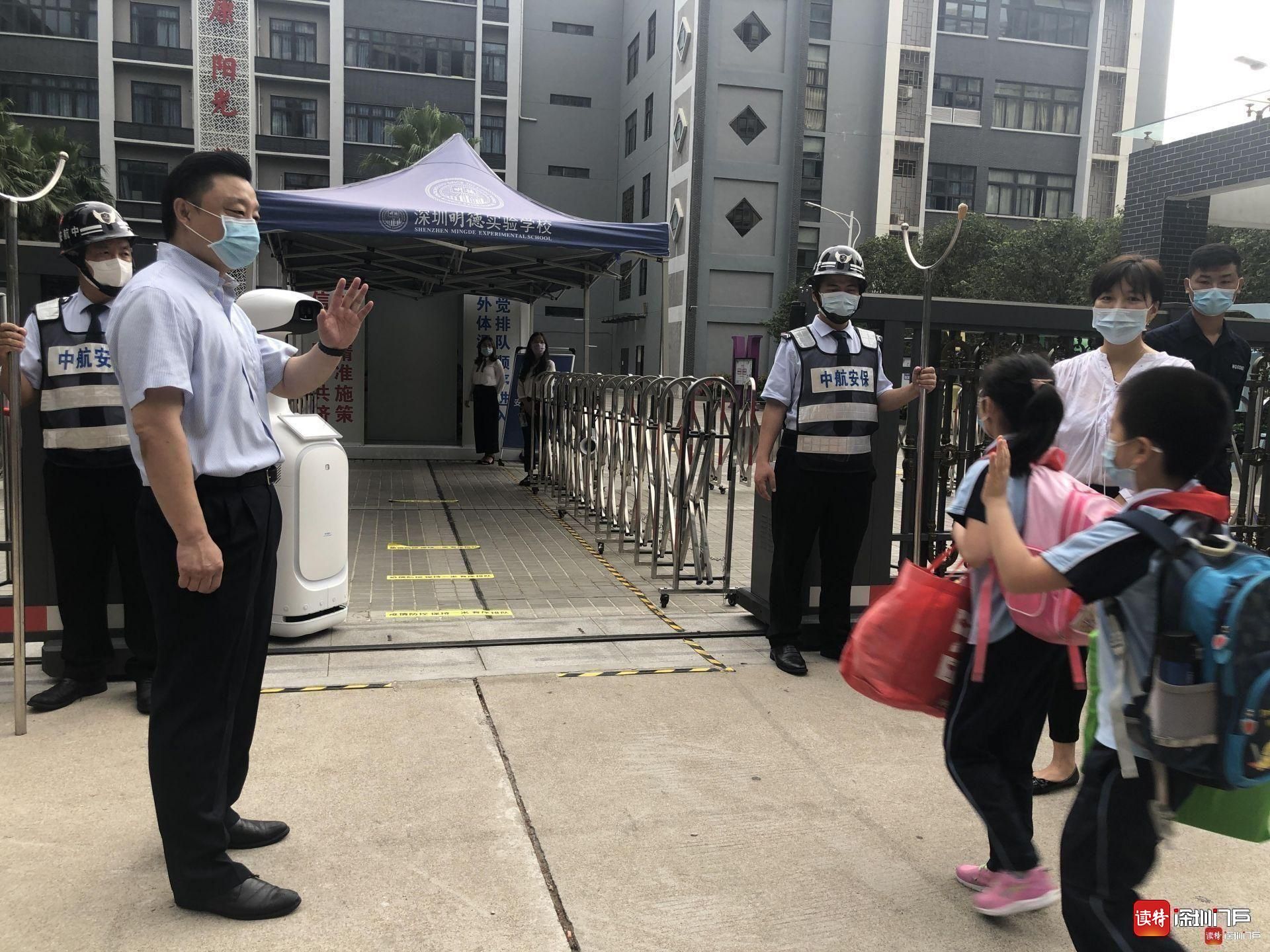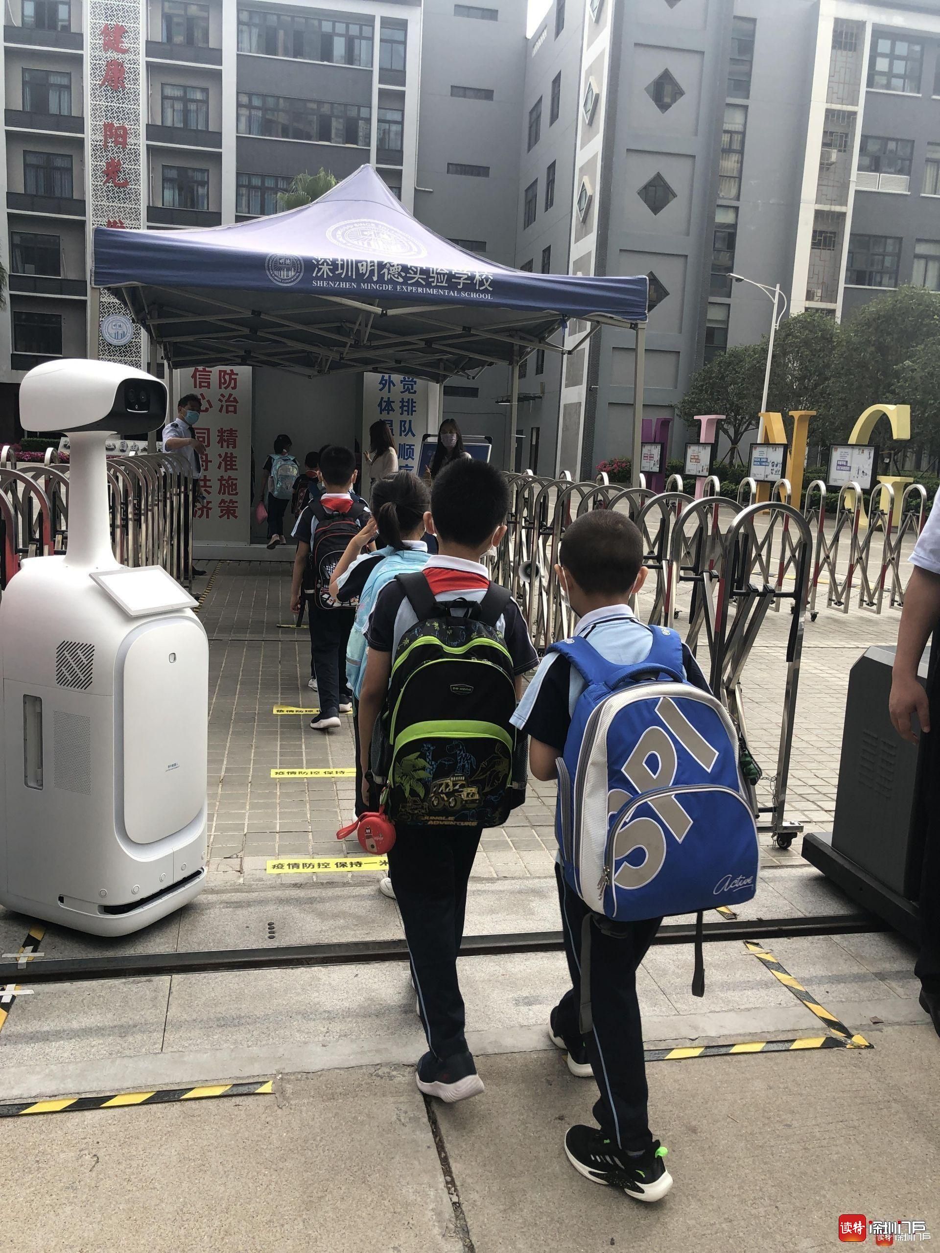“同學(xué)們好!”“歡迎回來(lái)!”從7點(diǎn)起,明德實(shí)驗(yàn)學(xué)校校長(zhǎng)魯江與工作人員就在香蜜校區(qū)校門口迎候?qū)W生們,提醒孩子們戴好口罩,也與家長(zhǎng)們交流返校事宜。校門口的一臺(tái)超氧水消殺機(jī)器人也在積極投入工作,工作人員在后臺(tái)控制面板可以監(jiān)測(cè)到入校人員的體溫情況。