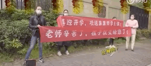 喜上眉梢的家長(zhǎng)們甚至站在校門口拉起橫幅:喜迎開(kāi)學(xué),歡送上課!