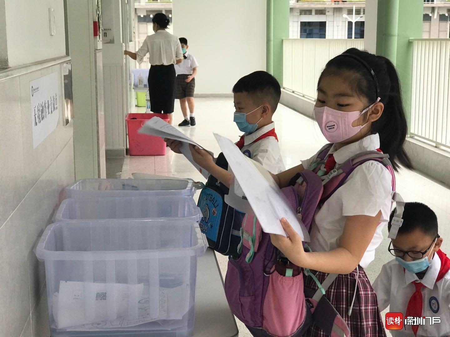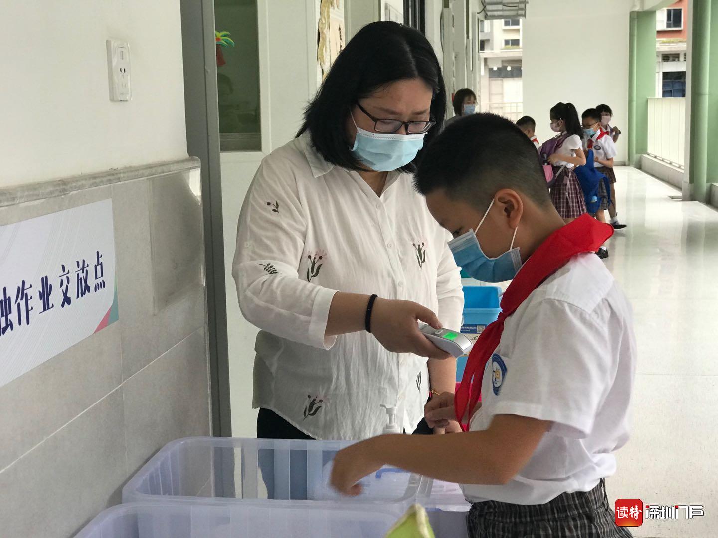 “同學(xué)們?cè)缟虾茫 薄袄蠋焸兒?!?8日一大早,龍華區(qū)和平實(shí)驗(yàn)小學(xué)的老師們都早早做好準(zhǔn)備,站在學(xué)校門口,迎接孩子們歸來(lái)。在各班教室門口,學(xué)校還貼心的準(zhǔn)備了“無(wú)接觸作業(yè)交站點(diǎn)”,同學(xué)們按順序自覺(jué)將學(xué)科作業(yè)放進(jìn)箱內(nèi),減少了不必要的接觸。(讀特記者何亞南)
